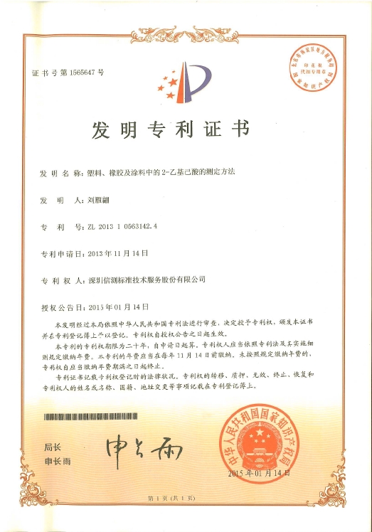 近日,深圳信测发明的“塑料、橡胶及涂料中的2-乙基己酸的测定方法”获国家知识产权局发明专利。