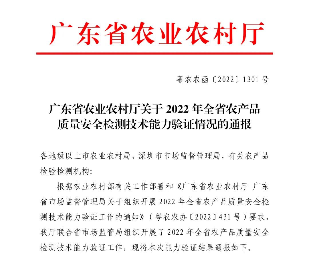 12月28日,广东省农业农村厅发文通报2022年全省农产品质量安全检测技术能力验证情况。在本次能力验证活动中,信测标准取得4项全A的成绩,展现出了过硬的专业素质和高超的技能水平。