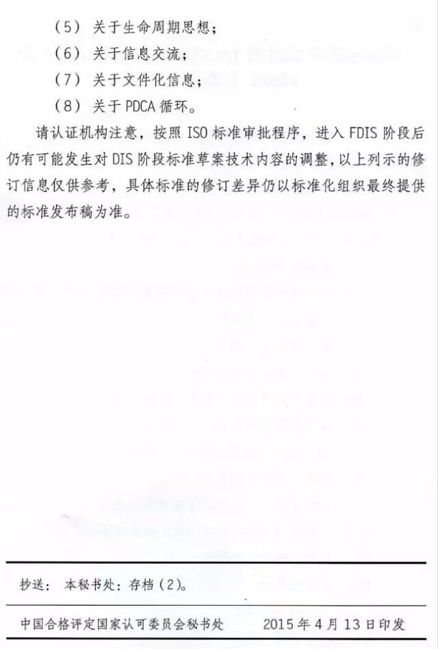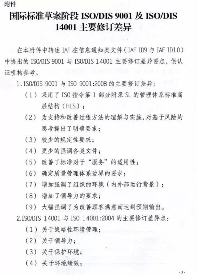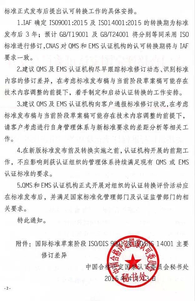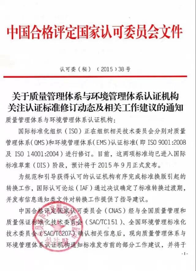 中国合格评定国家认可委员会(CNAS)经与全国质量管理和质量保证标准化技术委员会(SAC/TC151)、全国环境管理标准化技术委员会(SAC/TC207)确认相关信息后,现向质量管理体系与环境管理体系认证机构通知标准发布前的部分工作建议,并将于标准正式发布后提出认可转换工作的具体安排。