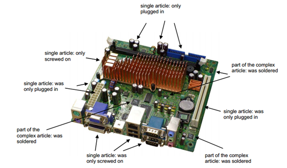 按照Once anArticle, Always an Article电脑中容易辨别出的单个物品如显示屏,按键,外壳,电缆,电路板,插头等,也有些物品是由很多单个物品组装起来的,如电脑中的PCB板,single article 所指为PCB板上的单个物品,这些容易从PCB板上移除的零部件作为物品单独考虑,剩下部分在不破坏PCB板的情形下不能进一步分离出单个物品时(如焊接在PCB板上的小零件),剩下部分(简化PCB板)视作物品。