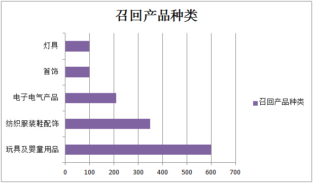 在被召回的产品中,玩具、婴童产品类,服装、纺织、鞋及配饰类产品,电子电气产品类都占有很大的比例,当然这也是我国出口的消费品的主要构成部分。其中玩具、婴童产品类别占总召回产品比例逾30%,服装、纺织、鞋及配饰类产品占总召回产品比例达20%,同时另一大块产品——电子电气产品的数量占总召回产品数量的比例也逾10%。另外,作为我国主要的出口产品类别的首饰及灯具类产品也有较高的召回比例,都占到了总召回产品比例的5%以上。