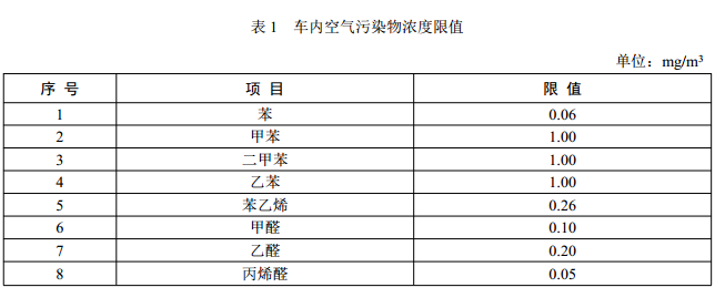 2011年,环境保护部和国家质检总局联合发布了《乘用车内空气质量评价指南》(GB/T27630-2011),于2012年3月1日起正式实施。指南根据车内空气中挥发性有机物的种类、来源和车辆主要内饰材料本身挥发特性,确定了8种主要控制物质,即车内空气中的苯、甲苯、二甲苯、乙苯、苯乙烯、甲醛、乙醛及丙烯醛,并规定了浓度要求。