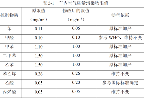 另外,考虑到原标准实施时的工业水平,有一些车内污染物限值设定较宽泛,与国际上同类物质的限值相比偏高。