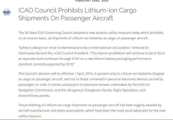 ICAO表决禁制民航客机运载锂电池,原因是这种电池可以自燃和引起大火,足以摧毁整架飞机。虽然ICAO理事会的决定并无约束力,但大多数国家会跟随它的做法。禁制将于4月1日生效。包括: