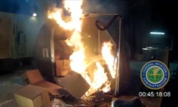 FAA曾经模拟一个航机货舱装满锂离子电池,当电池短路,释放出氢气等气体,气体燃烧时发生强烈爆炸,舱内浓烟密布,机舱内的灭火系统虽然可以扑灭火种,但未能阻止电池继续发热,令火势死灰复燃,爆炸威力可爆开飞机机身。
