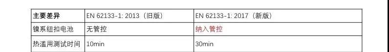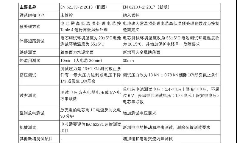 2017年5月12日,欧洲电工标准化委员会曾发布了EN 62133:2017版,分别为镍系电池适用的EN 62133-1: 2017及锂系电池适用的EN 62133-2: 2017。该两版标准已于2020年3月14日起在欧洲强制实施,同时旧版(EN62133:2013版)将不被接受。