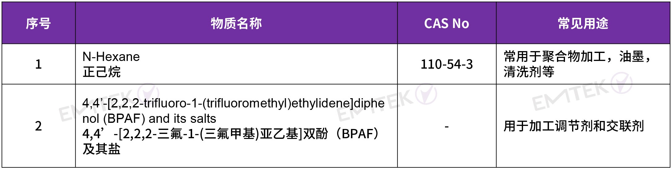 2026年02月04日,欧洲化学品管理局(ECHA)正式将下面2项物质纳入SVHC物质清单。至此,SVHC物质清单由原来的251项增加至253项,此前评议的物质4,4’-二羟基二苯甲烷(双酚F,BPF)已被撤回。